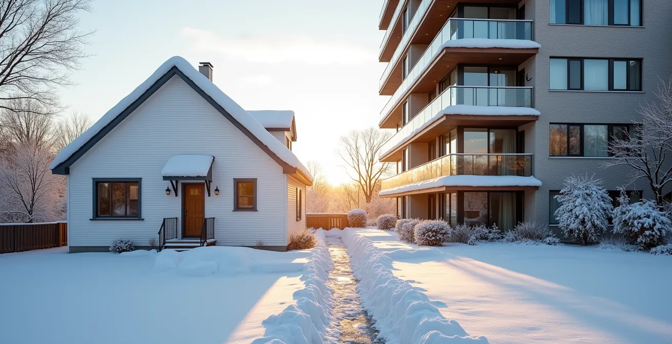 Pour un premier acheteur au Québec, le dilemme est classique : la liberté d’une maison unifamiliale ou la simplicité apparente d’un condo en copropriété divise ? Le débat se concentre souvent sur le prix d’achat, l’espace et les corvées d’entretien. On oppose la tranquillité d’un jardin privé aux avantages d’une vie sans déneigement ni tonte de pelouse. Cette vision, bien que juste en surface, occulte le véritable enjeu financier qui se joue sur le moyen terme. La question n’est pas seulement de savoir quelle option coûte le moins cher aujourd’hui, mais laquelle protégera le mieux votre capital et offrira la meilleure rentabilité nette réelle après cinq ans.